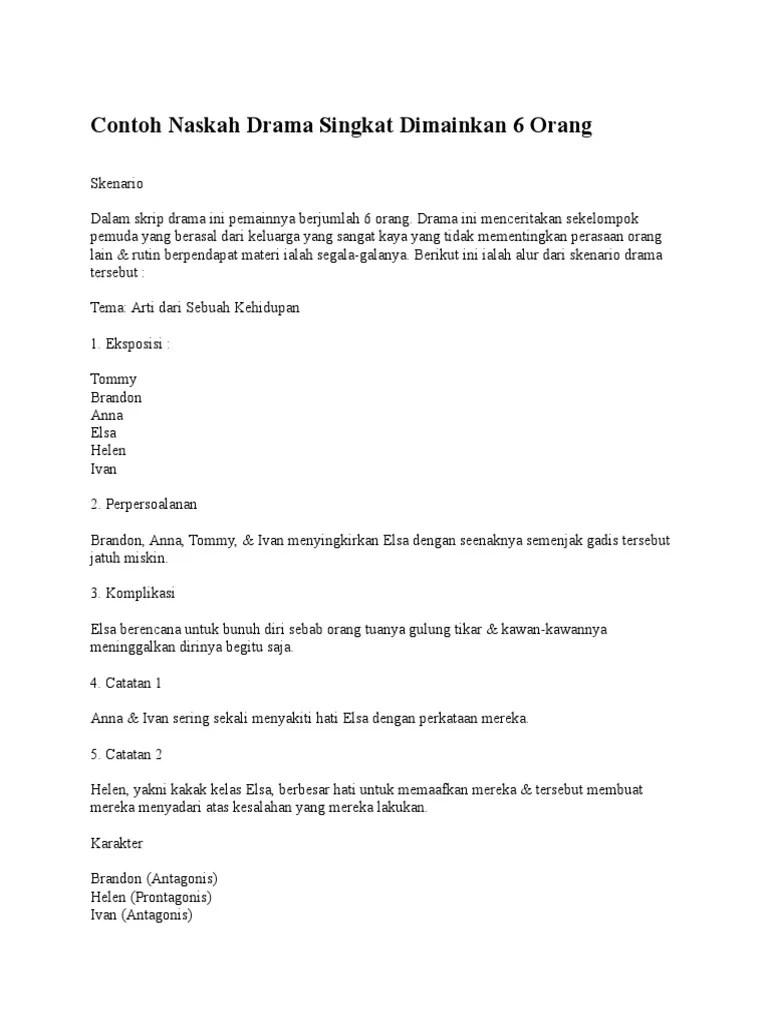 Naskah drama 6 orang bertema persahabatan. Tentang masa depan tema : Sosial & persahabatan jumlah pemeran : Kumpulan contoh naskah drama 6 pemain (singkat, pendek, padat, lucu, dan unik). Diharapkan, siswa dapat menulis esai pendek untuk menggambarkan pengamatan. Contoh naskah drama persahabatan pendek 6 orang. Bentrokan dalam asrama di sebuah ruangan besar duduklah anas dan hadi. Di sebuah rumah mewah dengan perabotan yang mahal, tampak dari ruang keluarga seorang pembantu yang tengah memasak di dapur. Contoh teks dialog drama untuk 6 orang judul : Nah, untuk mendalami teks drama, sebaiknya . I) exposisi jony johan lukman wati nia rony ii) permasalahan jony secara tidak sengaja .